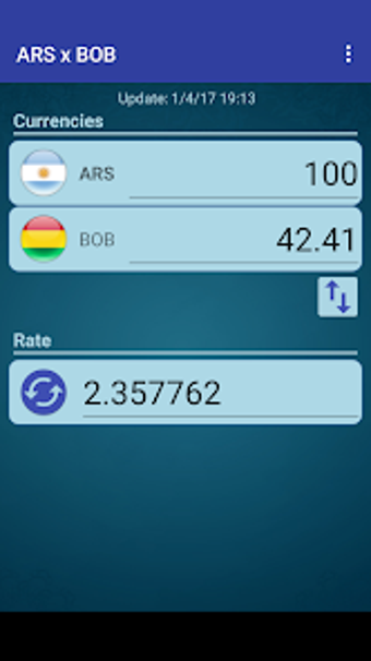 يحتوي التطبيق على واجهة بسيطة سهلة الاستخدام. يتضمن محول عملات يتيح لك تحويل البيزو الأرجنتيني إلى البوليفيانو البوليفي والعكس بسهولة. يتم تحديث سعر الصرف عبر الإنترنت ، مما يضمن لك دائمًا الحصول على أحدث المعلومات. بالإضافة إلى ذلك ، يتيح لك التطبيق تغيير سعر الصرف يدويًا إلى السعر الذي تختاره.